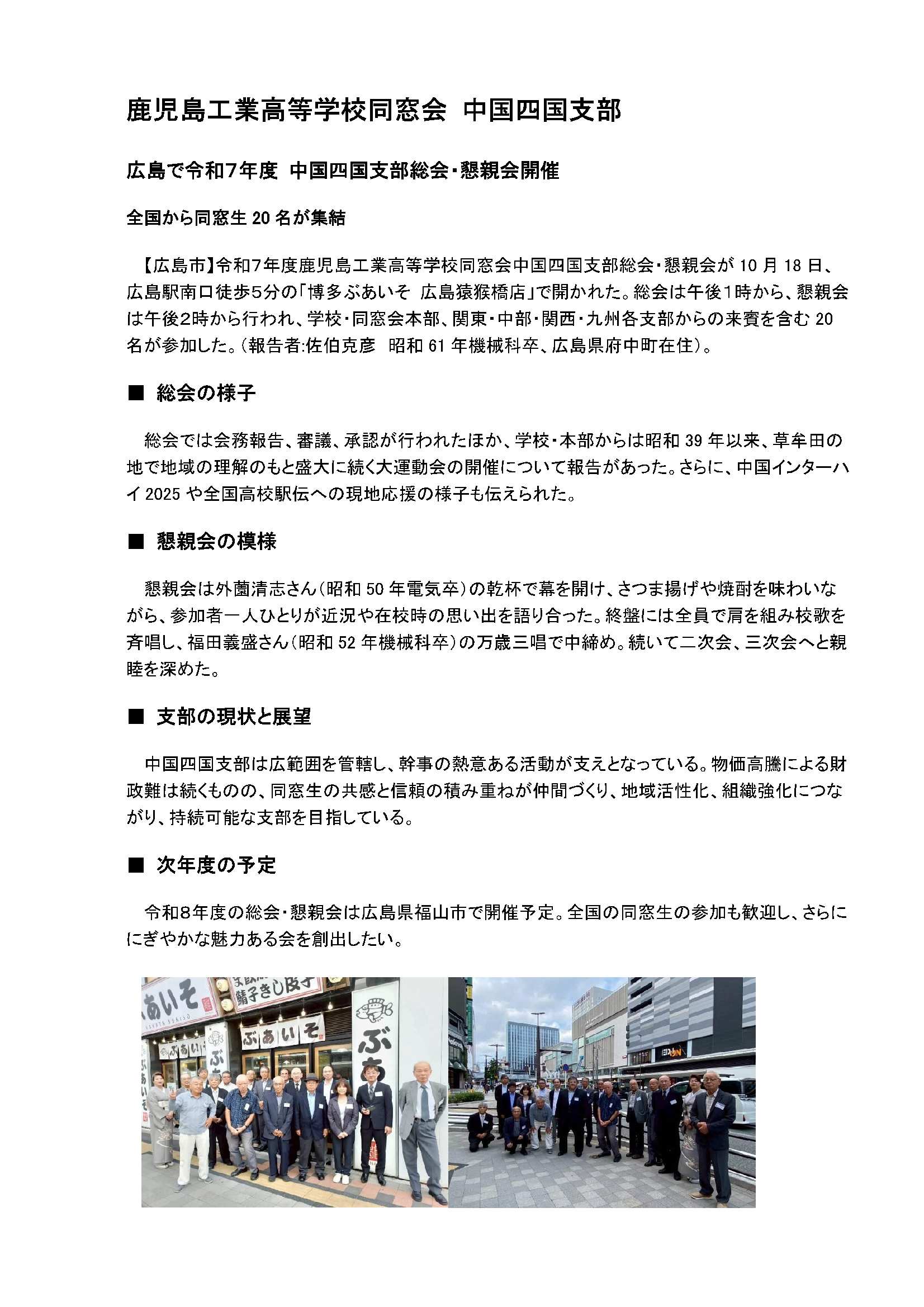 全国の鹿児島工業高等学校同窓会の皆様におかれましては、益々ご健勝のこととお喜び申し上げます。令和7年度九州支部総会・懇親会を6月7日(土)に福岡市内の冷泉閣ホテル川端で開催しました。